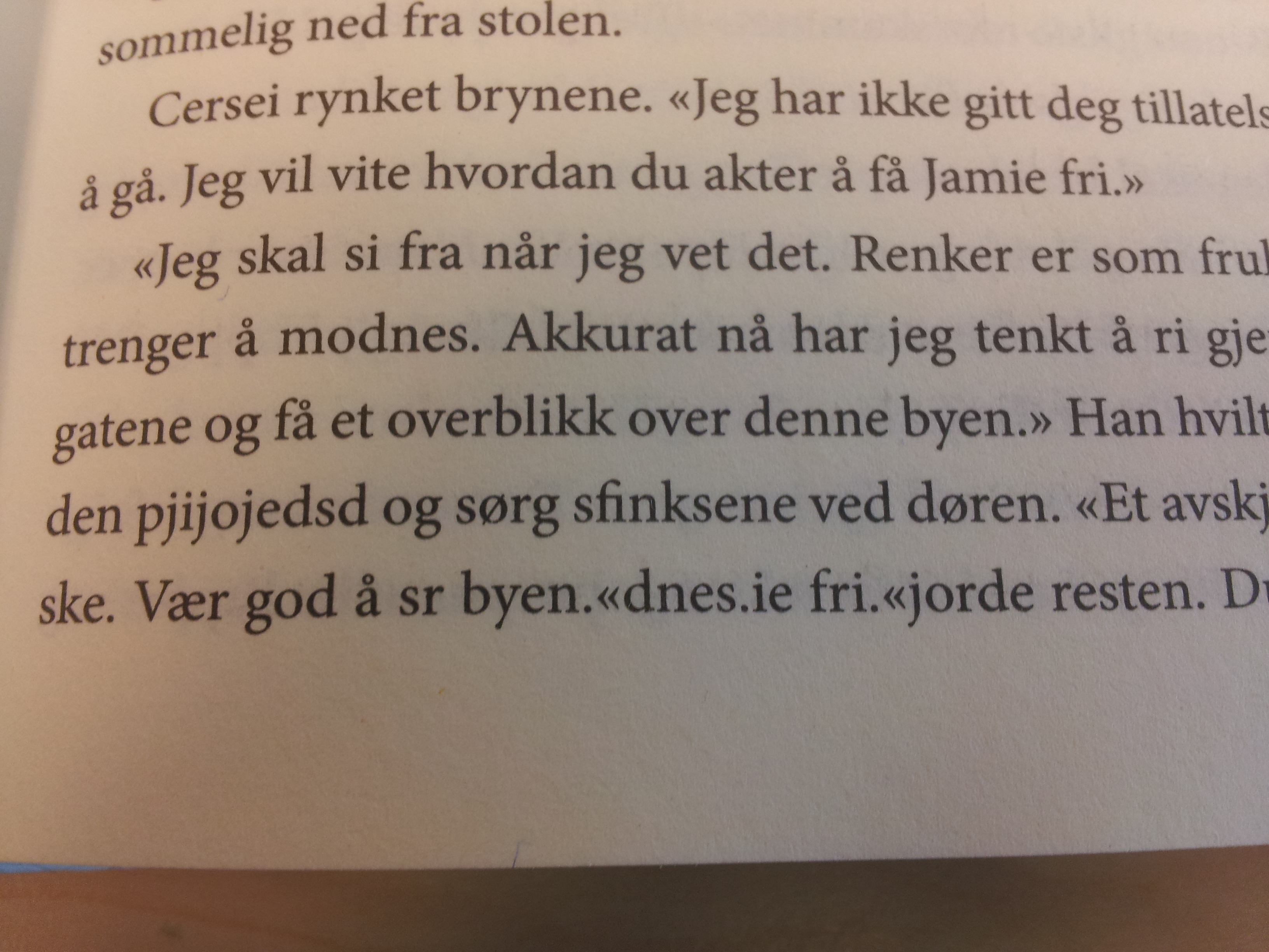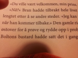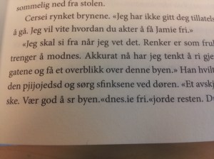 Jeg fant også andre og/å-feil på min ferd gjennom «Kongenes Kamp». Da jeg var ferdig med boken, var jeg i grunnen ganske skuffet. Er det virkelig slik at man er nødt til å lese bøker på originalspråket for å få en god leseropplevelse? Krever jeg for mye av forlagene? Jeg mener helt bestemt at svaret er et høyt og rungende:NEI! Jeg har derfor besluttet å sende en misfornøyd epost til både oversetter og forlag, ja så sær er jeg. Jeg er i min fulle rett ettersom jeg har betalt 300 kroner for noe som helt klart ikke holder mål. Jeg regner med jeg ikke er den første som kommer med kritikk, men det får så være. Når jeg nå skal begynne på «Dragenes Dronning» krysser jeg fingrene for at jeg skal slippe å bli frustrert over dårlig språk. Disse bøkene fortjener jo så mye mer.