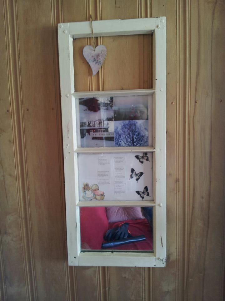 Nå som det er påske, har jeg forflyttet meg fra Lillehammer til Modum kommune, http://no.wikipedia.org/wiki/Modum nærmere bestemt Øst-Modum. Her sitter jeg godt plassert i sofaen med «Fjols til fjells» på tv, en kopp te og sist, men ikke minst kvikk lunsj. Palmeolje eller ikke, ingen påske uten. Påske er den eneste tiden på året jeg spiser denne sjokoladen, så jeg har ikke så altfor dårlig samvittighet, jeg døyver den med sjokolade. Hittil har det vært en aldeles strålende påske. Været har vært som bestilt, og jeg har ikke ligget på latsiden. For ikke så lenge siden ble jeg hytteeier. Hytta ligger på Øst-Modum, ja det er faktisk naboeiendommen til opphavet. Når virketrangen kommer over meg, stikker jeg opp på hytta for å male og pusse opp. Min venninne Leni gav meg ideen til å pusse opp et gammelt vindu og henge det på veggen. Hun skaffet til veie to gamle vinduer, som vi satte av en dag for å pusse opp.