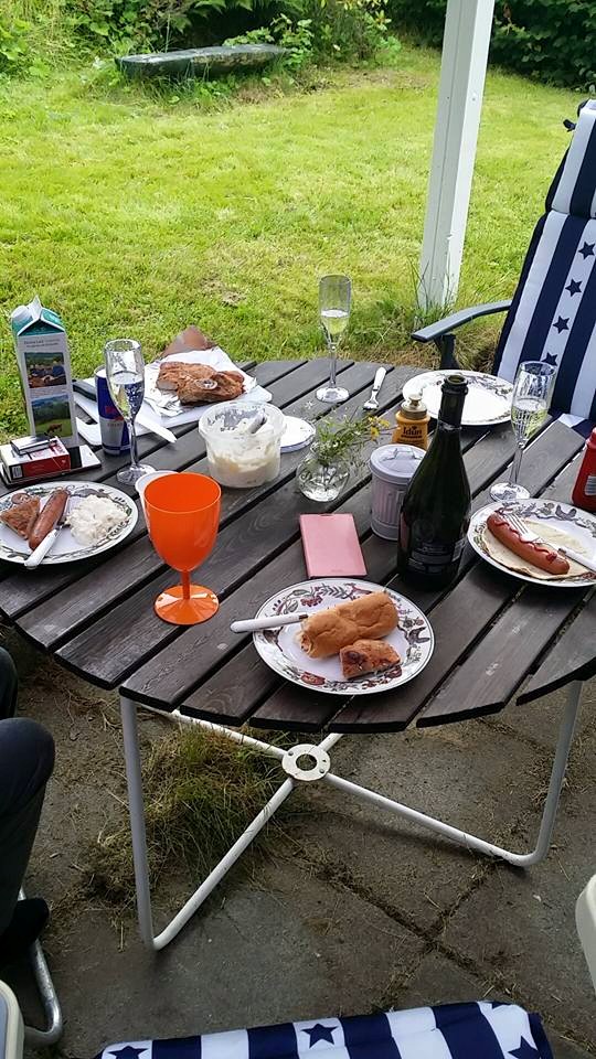 Det ble flere kvelder med grilling, ja en av disse var det til og med oppholdsvær. Det var en herlig kveld, med digg mat, latter og prosecco. Jeg hadde en elektrisk bordgrill, som jeg var overbevist om fungerte som den skulle. Heldigvis for meg, og de andre, hadde Jane tatt med sin grill, som faktisk fungerte, i motsetning til min, skulle det vise seg. I stedet for «gråt og tenners gnissel» ble det altså flintsteik og pølser med diverse tilbehør.