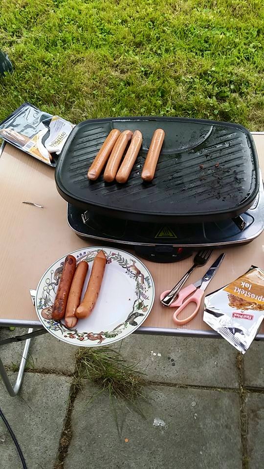 Jeg hadde planer om å skryte av Øst-Modum til de som kom på besøk, men:»Se så fint det er her!» fungerer liksom ikke like bra når regnet høljer ned og brunsneglene popper opp over alt. Min venninne Tina hater brunsnegler, ja snegler generelt tror jeg. Det må ha vært ganske traumatisk for henne å gå gjennom hagen. Vi var en gjeng på fem som bodde på hytta mi i noen dager. Gresset var vått, på grunn av det evigvarende regnet, så vi var en gjeng på fem med konstant våte sko og kalde føtter. Den første kvelden ble det grilling, under tak vel og merke. Jeg hadde luket og raket som en gal for at plattingen skulle se ordentlig ut, noe den også gjorde til slutt.