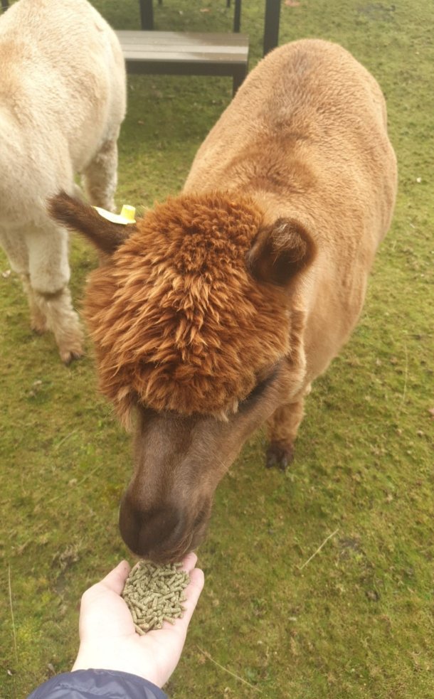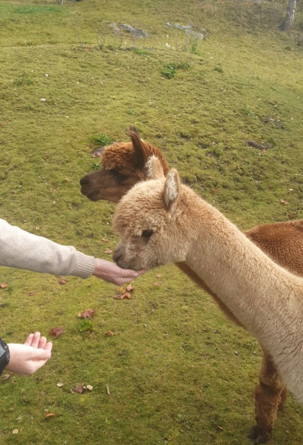 De var litt skeptiske til fire nye mennesker, men det hjalp veldig at vi hadde mat. Alpakkaene var veldig forsiktige da de spiste. Det var litt som når kaninene spiser av hånda mi. Koselig.