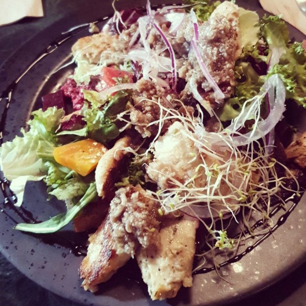 Den 04. Oktober møtte jeg Hege og Anders i byen. De var på helgebesøk hos Anders sine foreldre. Vi dro på Atlier Kakao for å spise. De spanderte frokost på meg. Jeg bestilte et smørbrød med Oumph og diverse andre sunne ingredienser. Det var veldig godt.