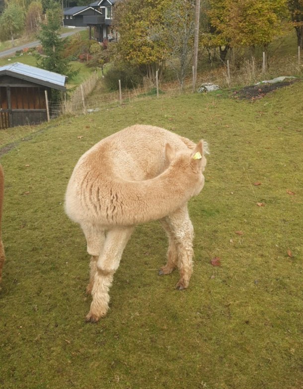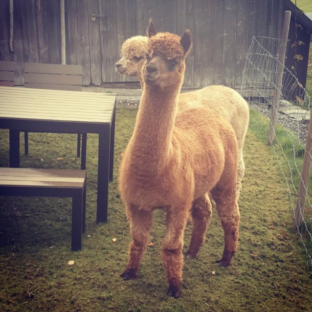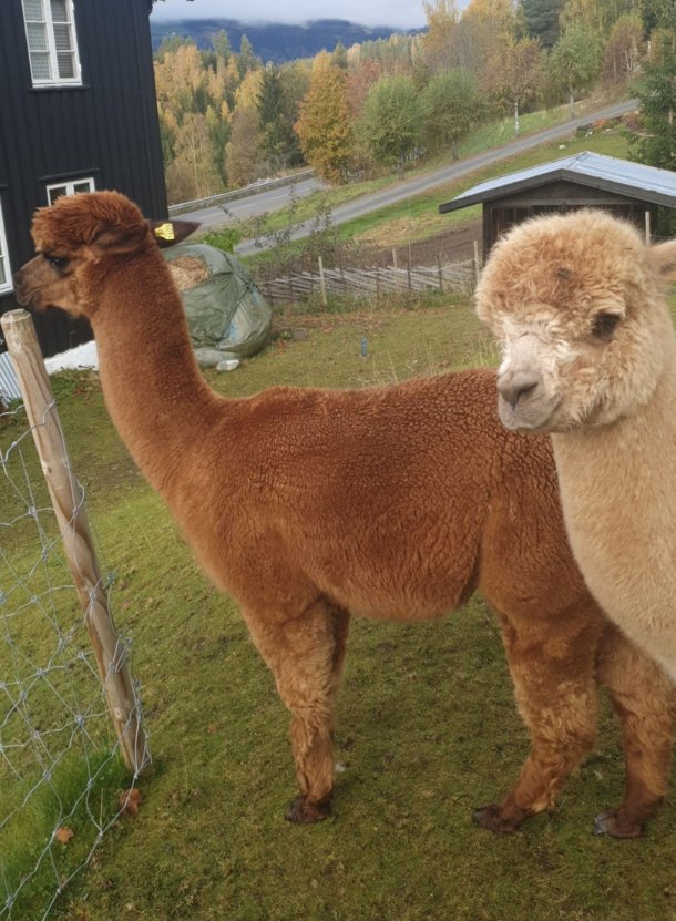 Peanøtt og Valnøtt blir, hvis jeg oppfattet det mannen sa riktig, ikke brukt i avl eller på utstillinger fordi de ikke er «perfekte» alpakkaer. Valnøtt ligner for mye på en kamel i ansiktet, og Peanøtt er for liten. Jeg synes de er perfekte som de er. Det tror jeg eieren synes også.