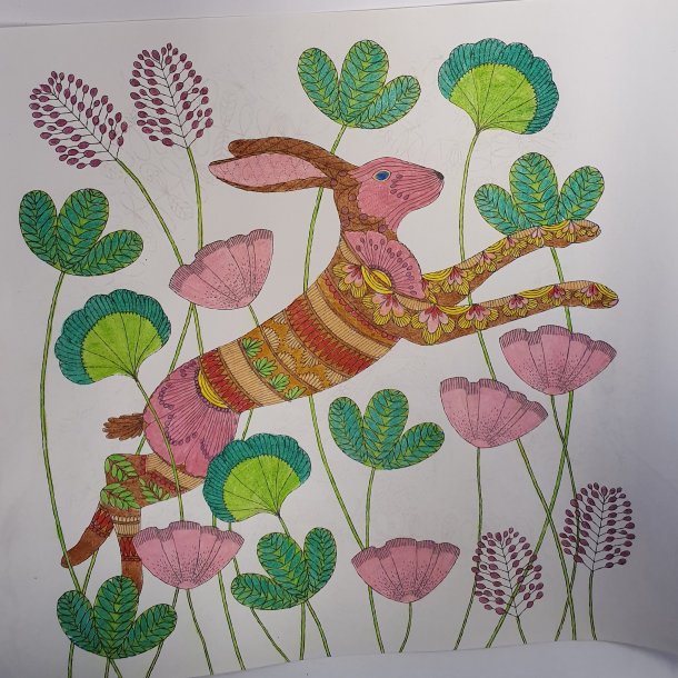 Jeg fargelagte denne kaninen i løpet av jobbøkta i går. Han ved siden av meg prøvde å kommentere at det ikke finnes rosa kaniner, men til ingen nytte, da jeg til stadighet fikk intervju. Synd, trist, leit. Det finnes ikke kaniner med blomster heller, men hele poenget er jo at det skal være kreativt.