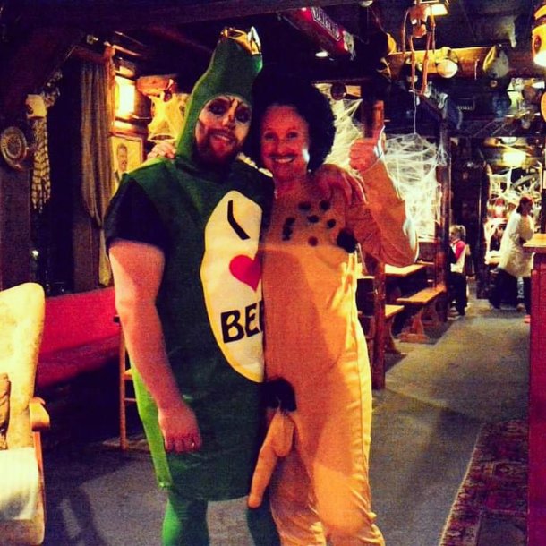 Det var en utrolig morsom kveld. Jeg tror alle hadde behov for en fest. Fozzy sølte litt øl, og Mia tulla med at han lakk . Morsomt. Vi dro en tur ut på Felix. Janne hadde bestilt bord. Man må det nå i disse dager. Det var mange artige kostymer å se. Folk koste seg, og det var skikkelig god stemning.