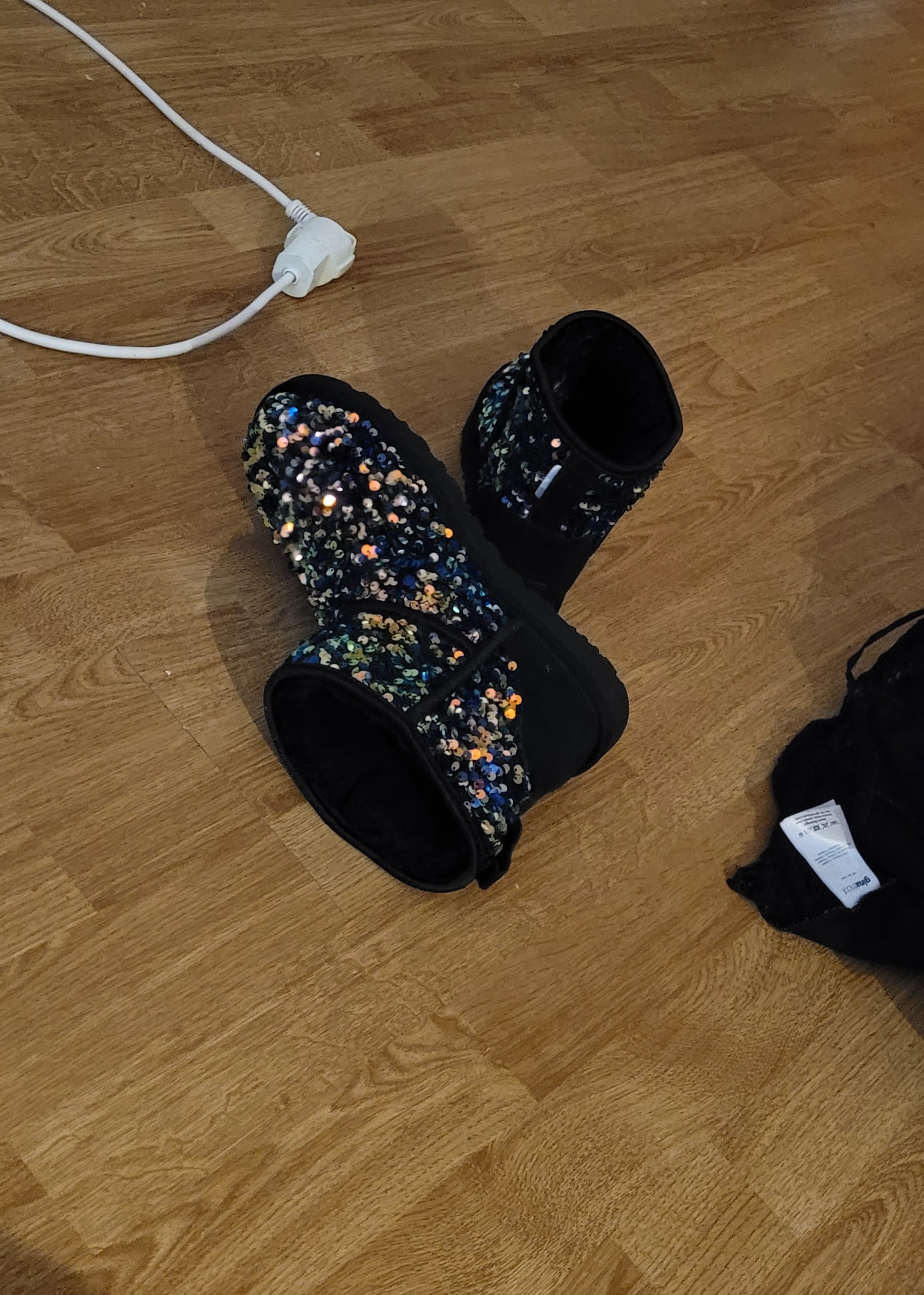 Jeg synes #frossenfebruar er ganske genialt. Kast minst mulig mat, vær mer kreativ, tenk nøye over hva du faktisk må bruke penger på. Det er utrolig mye man egentlig ikke trenger. Nå skal det sies at jeg har brukt litt penger denne måneden, til tross for min intensjon om å ikke gjøre det. Jeg tok en drosje fra Henia og hjem forrige helg (hadde på munnbind). Jeg kjøpte også et par dyre Uggs fra Strada. Dette skjedde etter at jeg for n’te gang hadde lidd meg gjennom en økt på jobb med gjennomfrosne føtter. Altså, jobbdelen var bra, frysedelen var slitsom. Jeg fikk blærekatarr, og det var tvingende nødvendig med noe virkelig varmt på føttene. Jeg var egentlig på jakt etter tøfler, men de har ofte så tynne såler, og da kunne jeg like gjerne bruke de jeg hadde fra før av. Valget falt på disse awesome skoene med et varmt saueull-indre og et sparkly ytre. Dette er nå mine innesko.