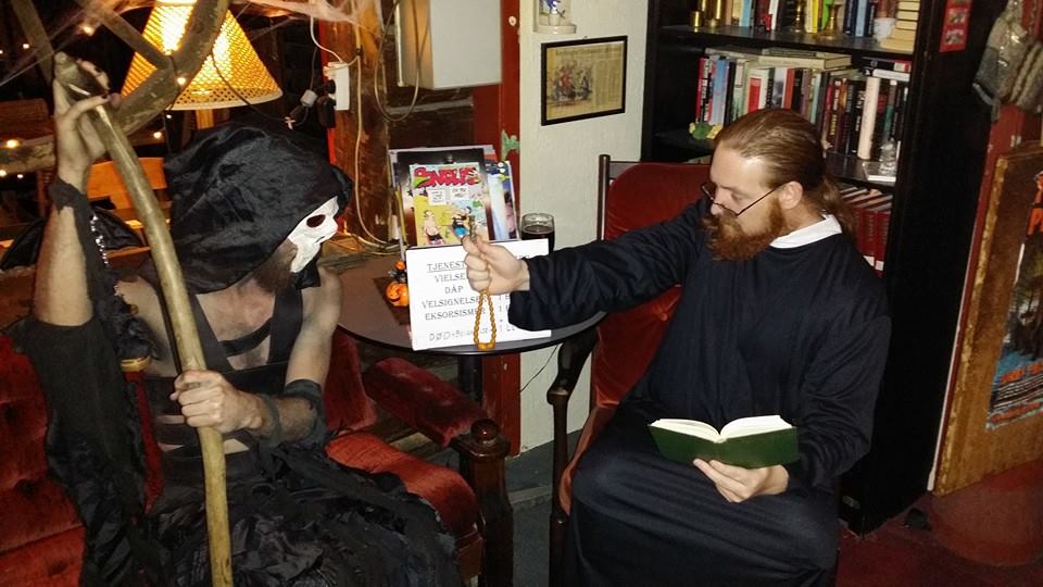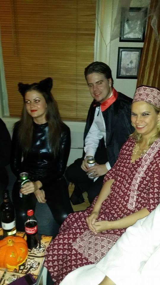 Helgen etter var det halloween. Jeg tar alltid av da. Jeg bestiller meg kostymer og diverse halloweengreier måneder i forveien. Fredag 31. var det fest på Felix. Jeg hadde planer om å ta en liten tur innom for få med meg alle de kule kostymene og sjekke livet, selv om jeg ikke kunne drikke så mye ettersom jeg hadde planlagt en fest med masse folk dagen etter. Rett etter jobb, ordnet jeg meg derfor og tok på meg catwoman-kostymet mitt. Utstyrt med pisk og ører, tumlet jeg meg gjennom slaps og sklei meg frem til Felix. Det hadde selvfølgelig begynt å snø. Ugunstig for både sminke og glatte støvletter. Jeg kom meg da frem og inn. Jeg skulle egentlig ikke ha gått dit bort alene, men de som skulle ha vært med meg var ikke i form. Jeg satset på at det sikkert var noen der jeg kunne sosialisere med. Det var det heldigvis også. Jeg slo meg ned sammen med Knut Ivar og hans søte kjæreste Tone. Førstnevnte var katolsk prest. Plutselig merket jeg at noen pustet meg i nakken, det var døden. Gjett om jeg skvatt. Det var et skikkelig kult kostyme. Melina tok bilder av oss og andre med oss, etter hvert som det ene artige kostymet etter det andre ankom gjennom døra. Det som er fint når man kler seg ut, er at man på sett og vis føler at man kan snakke med alle. I hvert fall gjør jeg det. Jeg tilbrakte kvelden med mange mennesker jeg ikke har møtt før, i tillegg til folk jeg kjente fra før. Det var topp stemning, og det etter bare å ha drukket to øl. Dette var alt jeg tok med råd til ettersom jeg jo skulle tidlig opp lørdagen.