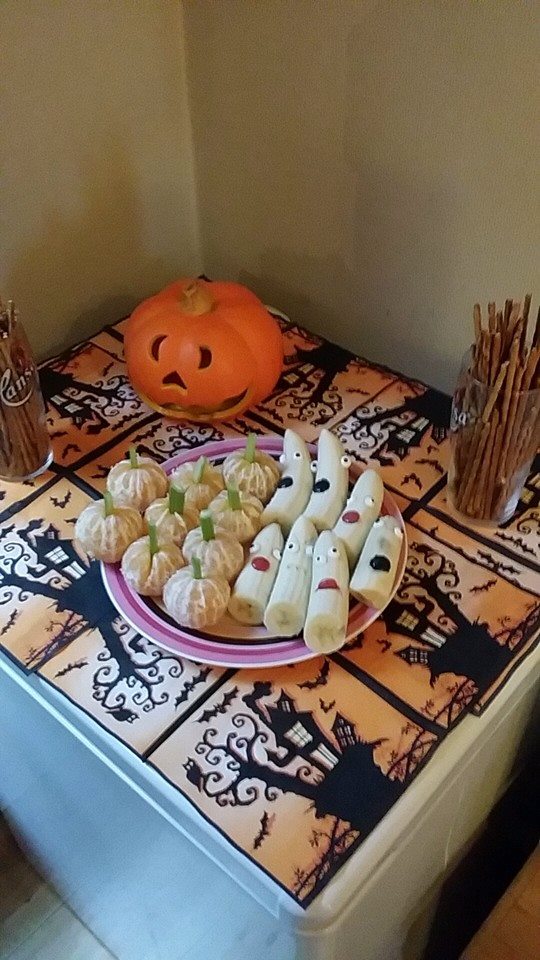 Jeg lagde også «gresskar» av skrellede klementiner med en bit stangselleri, blodig popcorn, bestående av smeltet smør med rød konditorfarge, bananspøkelser og kjeks med olivenedderkopper. Noe ble spist opp, mens mye fikk være i fred for grafsende hender.