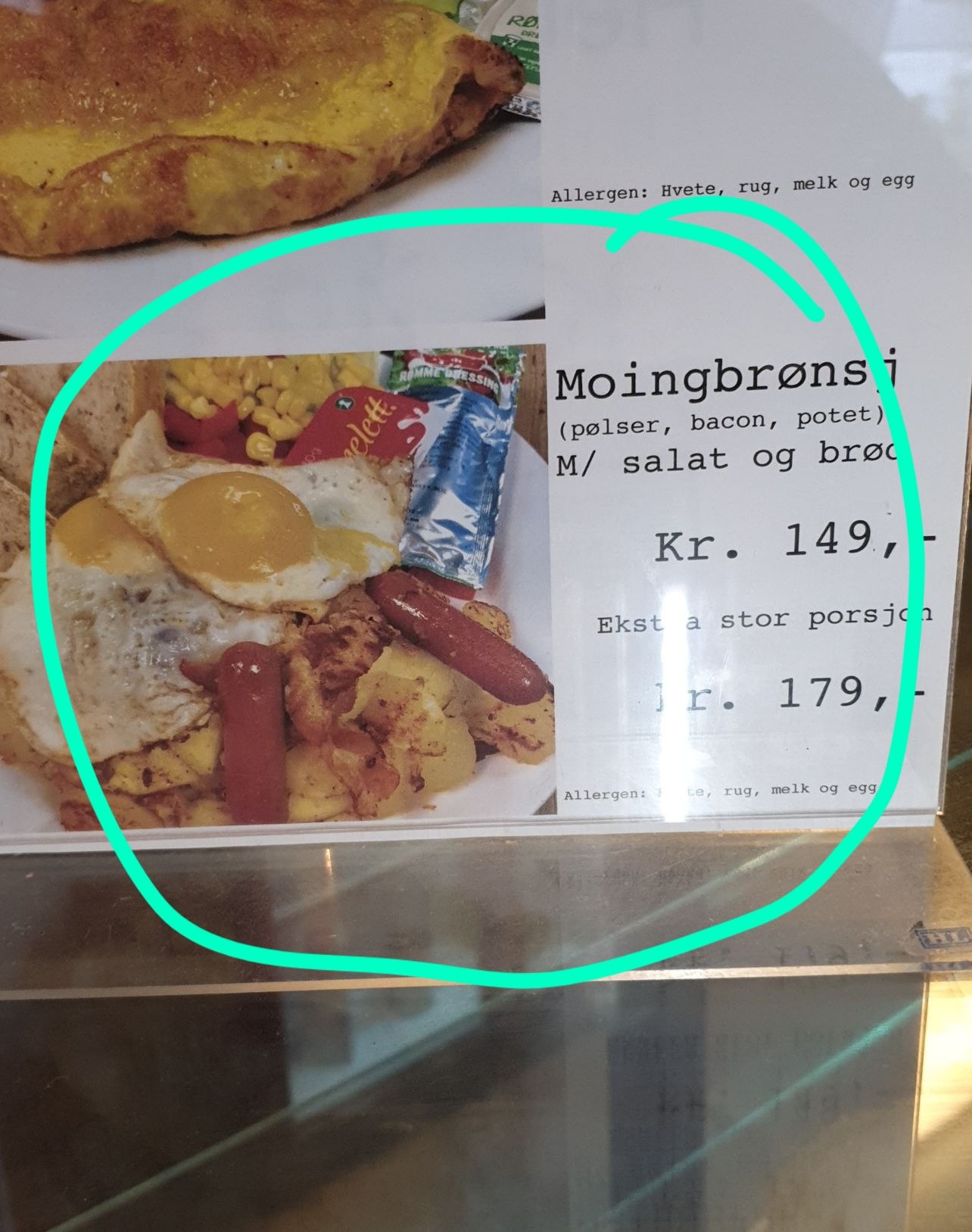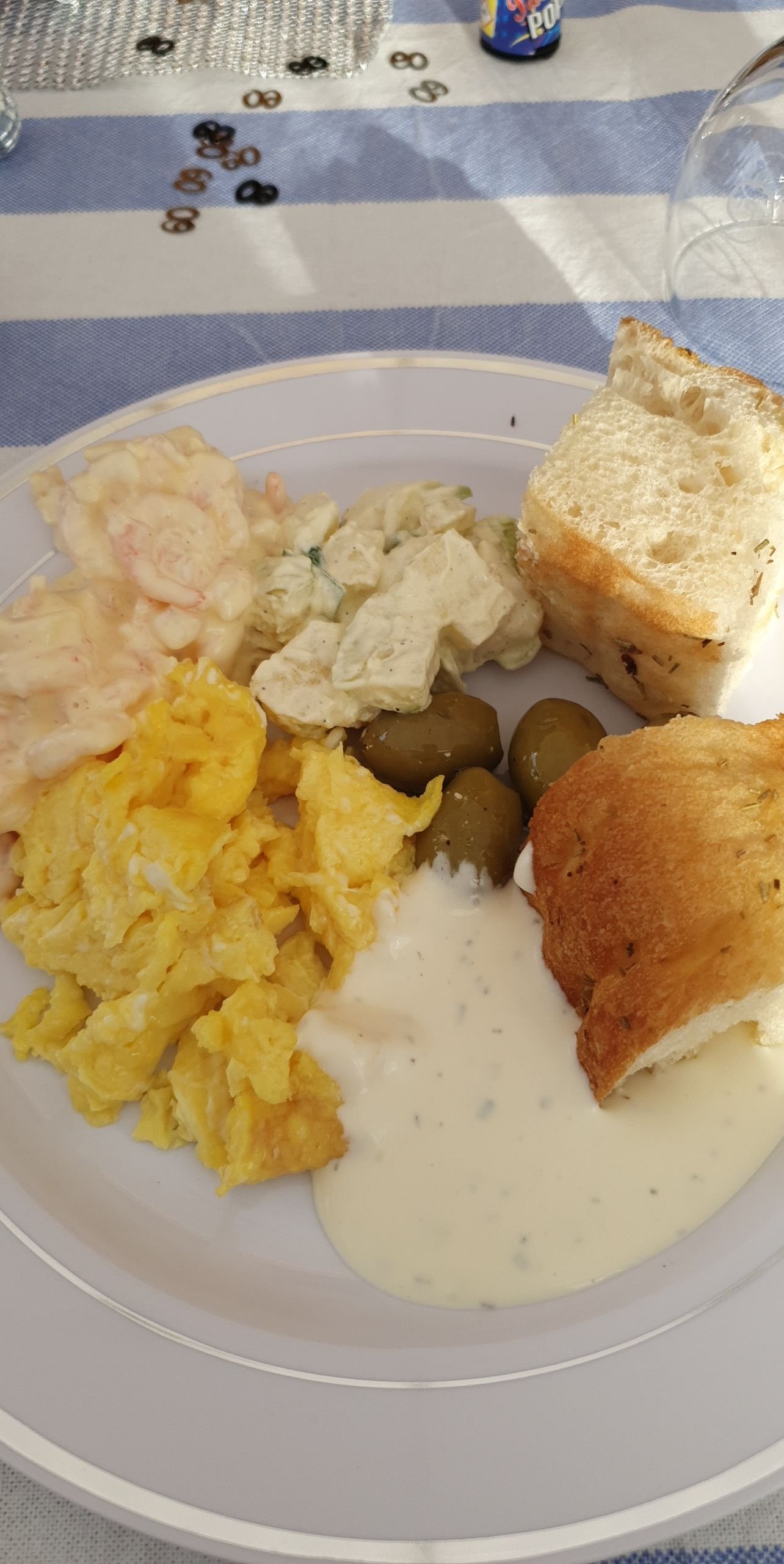 Christian ser bra ut. Jeg derimot ser full ut, men det var jeg jo også 🤣. Vi la oss ikke sånn kjempeseint. Det var jo tross alt en dag i morgen også. Det ville vært løgn å si at vi våknet opp friske og raske. Det var hyppige besøk på do og klynking. Ettersom det pleier å hjelpe litt med mat, dro vi bort til restauranten hvor frokosten ble servert. Vel, vi prøvde. Først gikk vi faktisk feil. Vi endte opp i «frokostsalen» til Commodore-kundene. Det var ikke oss for å si det sånn. Vi tok fatt på den harde veien til rett «frokostsal.» Jeg gikk med energiske skritt, mens Christian subbet etter med et lidende uttrykk i ansiktet. Det var selvfølgelig vanskelig å finne bord rett ved maten. Vi fant oss et bord til slutt og hentet oss mat. Ingen av oss hadde noe særlig matlyst.