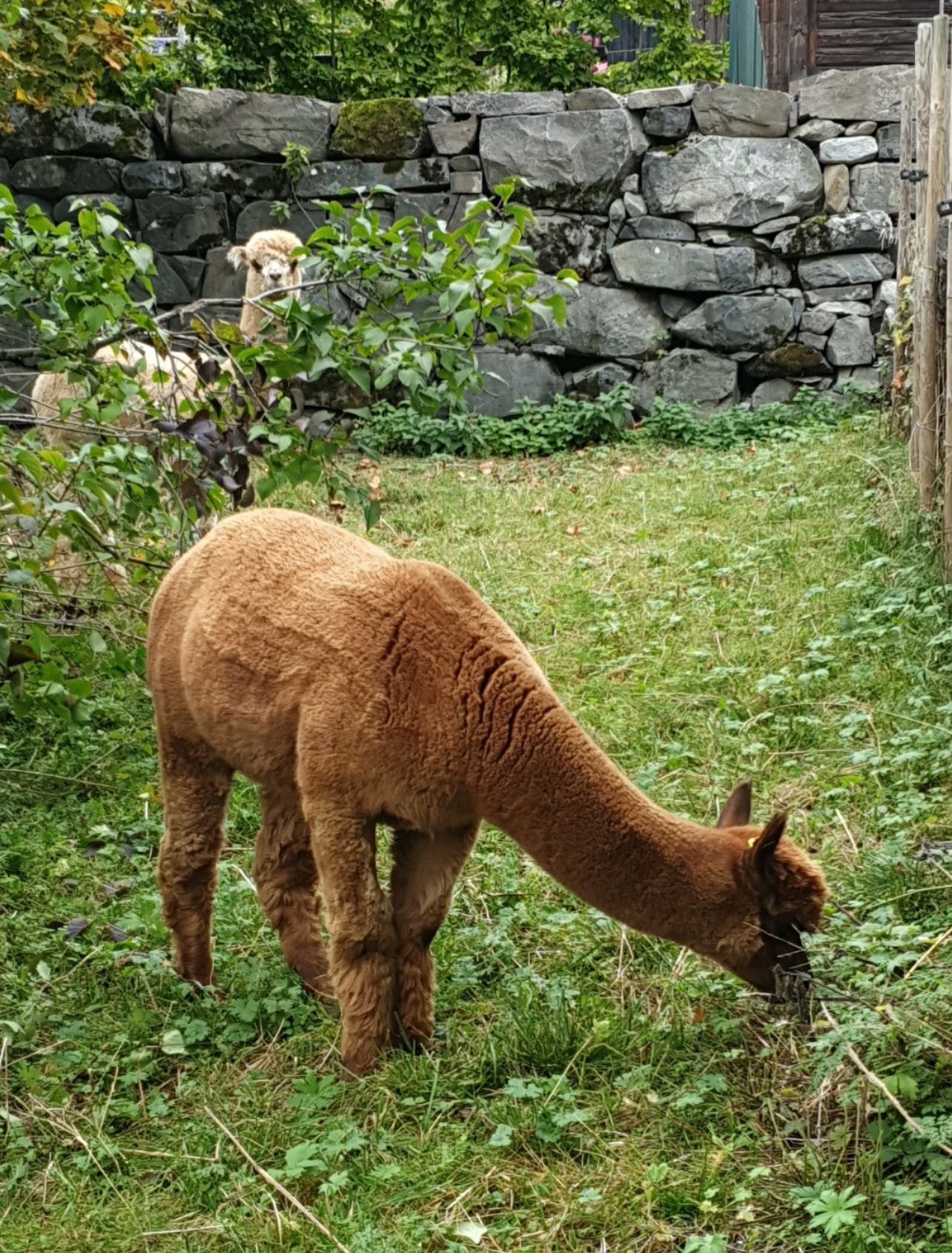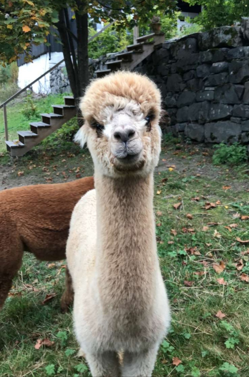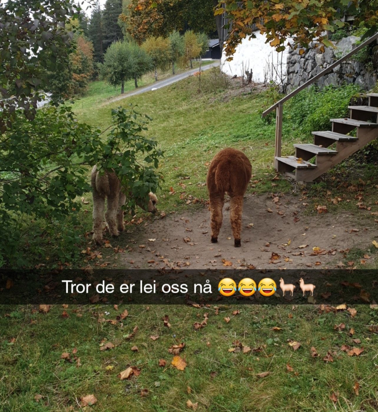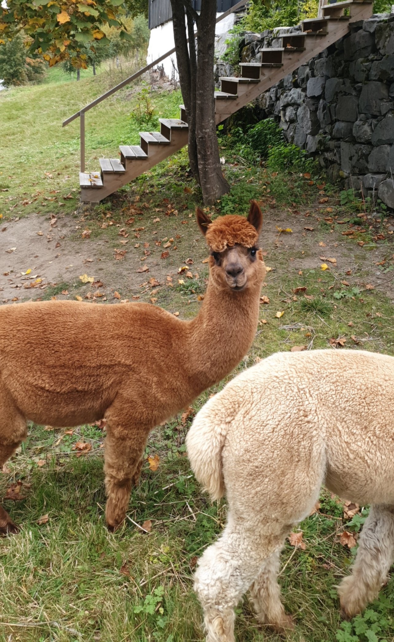 I går var Ida og jeg på 🦙 eventyr. Det begynte med at jeg så det jeg trodde var en lama på en snap fra John-Are, det viste seg å være en alpakka. Jeg fant ut at det bor noen på Brøttum, rett over grensa til Hedmark, som har to alpakkaer i hagen sin. Jeg hørte om Ida hadde lyst til å være med å hilse på dem. Det hadde hun. Vi fant frem uten problemer. Jeg ble helt overlykkelig da jeg så to utgaver av «keiser Kuzko» mumse bedagelig på noen gresstuster. Ja, jeg vet at Kuzko ble til en lama, ikke en alpakka, men til mitt forsvar så er de veldig like. Jeg gikk opp til huset og banket på, men det var ingen hjemme. Jeg hadde lyst til å høre om det var greit at vi koste med dem. Man vet jo ikke hva slags lynne de har. Jeg har ikke sånn kjempelyst til å bli bitt eller spyttet på. De var jo kjempesøte, og de virket veldig nysgjerrigepå oss, men man vet jo aldri når det gjelder dyr. Vi fikk tatt noen fine bilder.