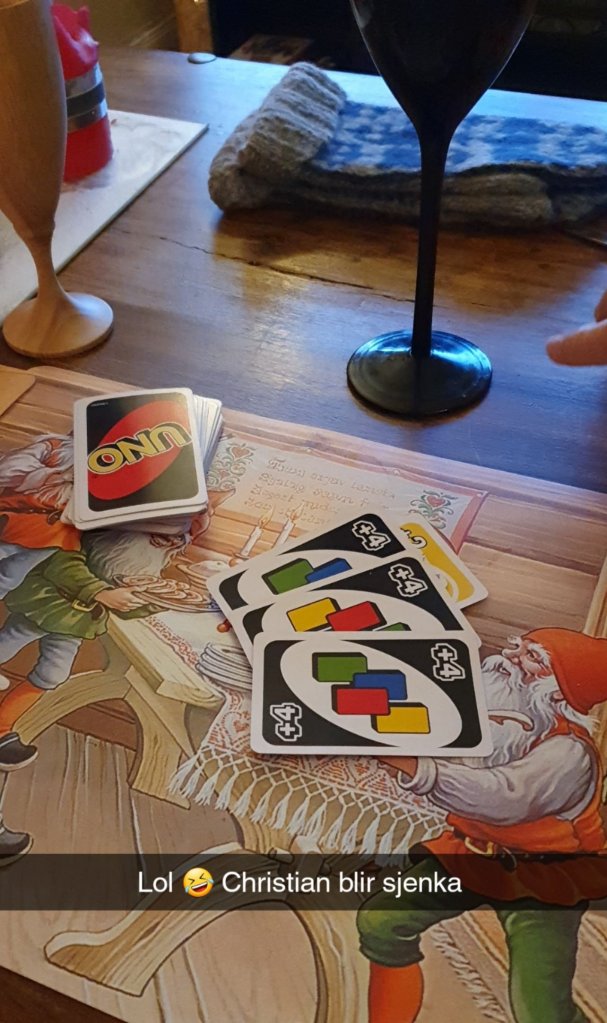 Christian, mamma og jeg spilte noen runder med Uno. Mamma drakk ikke, men vi andre spilte fylleutgaven. Dette var mens vin-nissen enda hadde litt pondus.