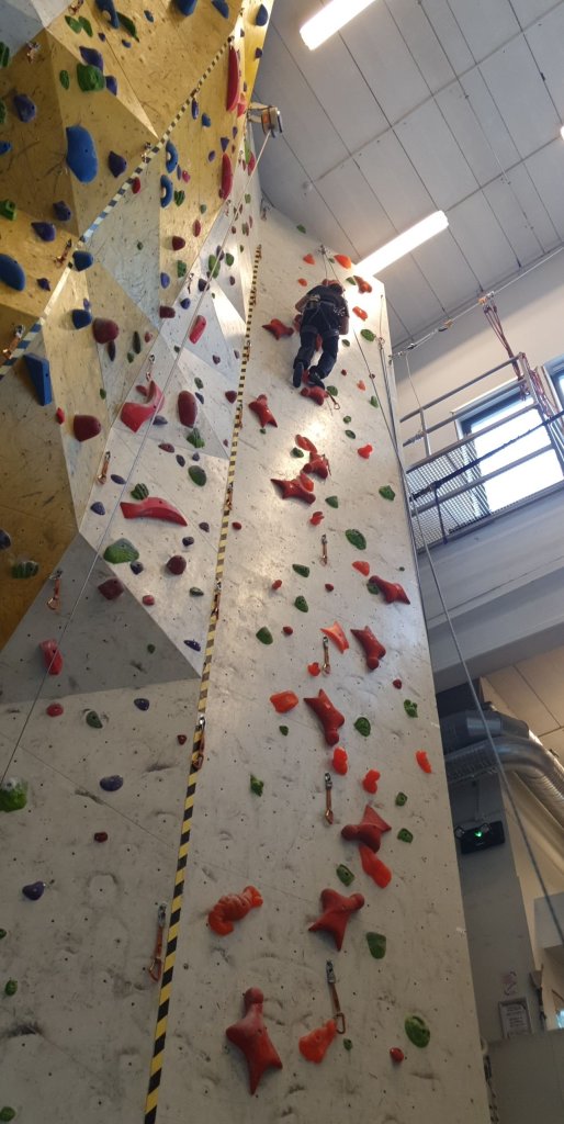 Etter barneveggen var det neste logiske skrittet å teste ut voksenveggen. Christian klatrer helt til toppen før man fikk sukk for seg. Christian er klatremus 🧗‍♀️.