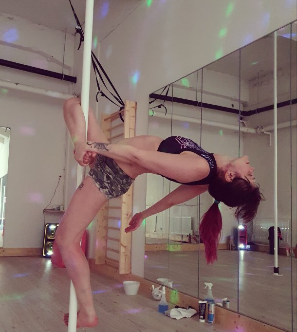 Denne uken har vært usedvanlig aktiv. Tirsdagen var det pole med Henia og Karoline. Det var en veldig artig time. Jeg øvde blant annet på «Hangback» og «Stargazer». Jeg innså hva jeg hadde gjort feil på «Hangback». Jeg satt for langt inn på stanga, og fikk dermed et dårlig grep. Lenger ut og mer lår fungerte veldig bra. Jeg hadde bedre kontroll, og følte meg mye sikrere. Elin var veldig flink til å veilede meg. Jeg lærer masse av henne. Det er ofte bare små detaljer som må på plass for at det skal fungere.
